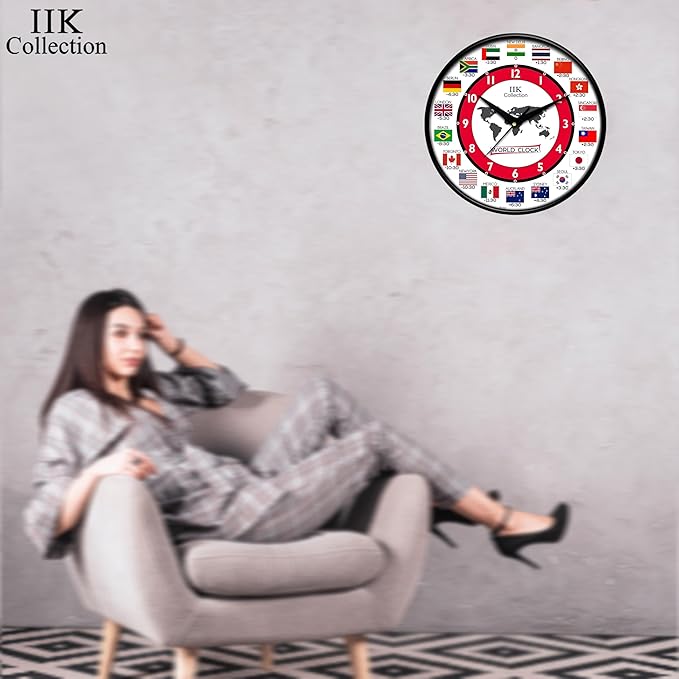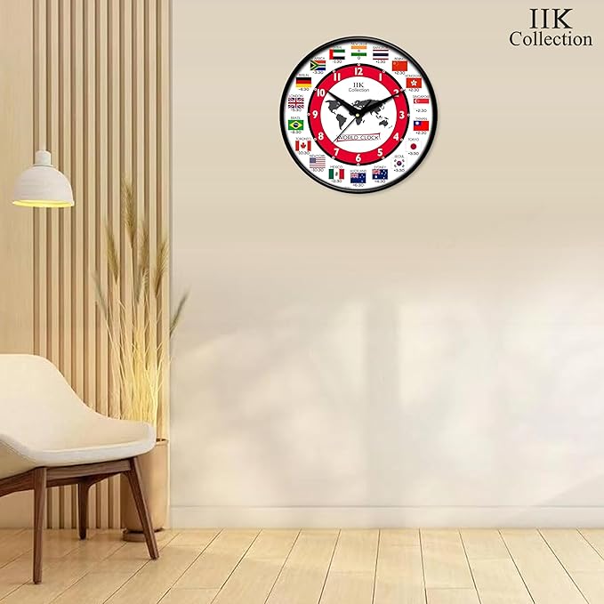 IK COLLECTION 12-inch multicolor world time clock with clear numbers, plastic frame, and glass face, suitable for home, kitchen, living room, bedroom, and office.